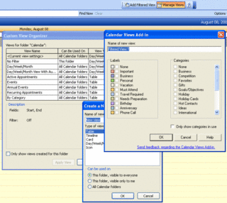 The Microsoft Office Outlook 2003 Calendar Views Add-in makes it easy for you to view your Outlook Calendar appointments through a filter that is based on Outlook labels and categories. For example, you can create a view that shows you only the appointments on your calendar that are labeled Must Attend, or are categorized as Important.