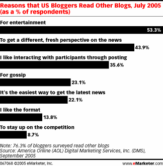 Yes, this is a tech blog but I saw this story and it seems pretty interesting (anotherwords, take a moment to read it). Apparently, half of the bloggers blog as a form of therapy and keep in touch with family. But half of the people reading blogs do so as a form of entertainment. Out of everyone polled by AOL, only 16% were seriously interested in journalism. I guess that puts to rest all the arguments about citizen journalists taking over the “professional” journalists jobs. I would beg to differ with that statement in the single area – Information Technology. The only reason you would ever subscribe to PC World, PC Magazine and such would be to read op-ed. Thats all those magazines have — just some dorks opinion (Dvorak, etc) and more often than not, not a very valuable opinion at that. Today you can get these opinions in real-time, not just from the hobbyists but from people that actually implement these solutions (me) people that design these solutions (Microsoft) and then everyone else involved in the actual product, delivery and support. So whose opinion on IT is more valuable? That of the people actually developing, providing and supporting IT or some burned out journalist that could not make it as an IT professional? Not a flame starter, I just don’t think PC Magazine and company can continue to exist as an advertising pamphlet while not really providing much else.