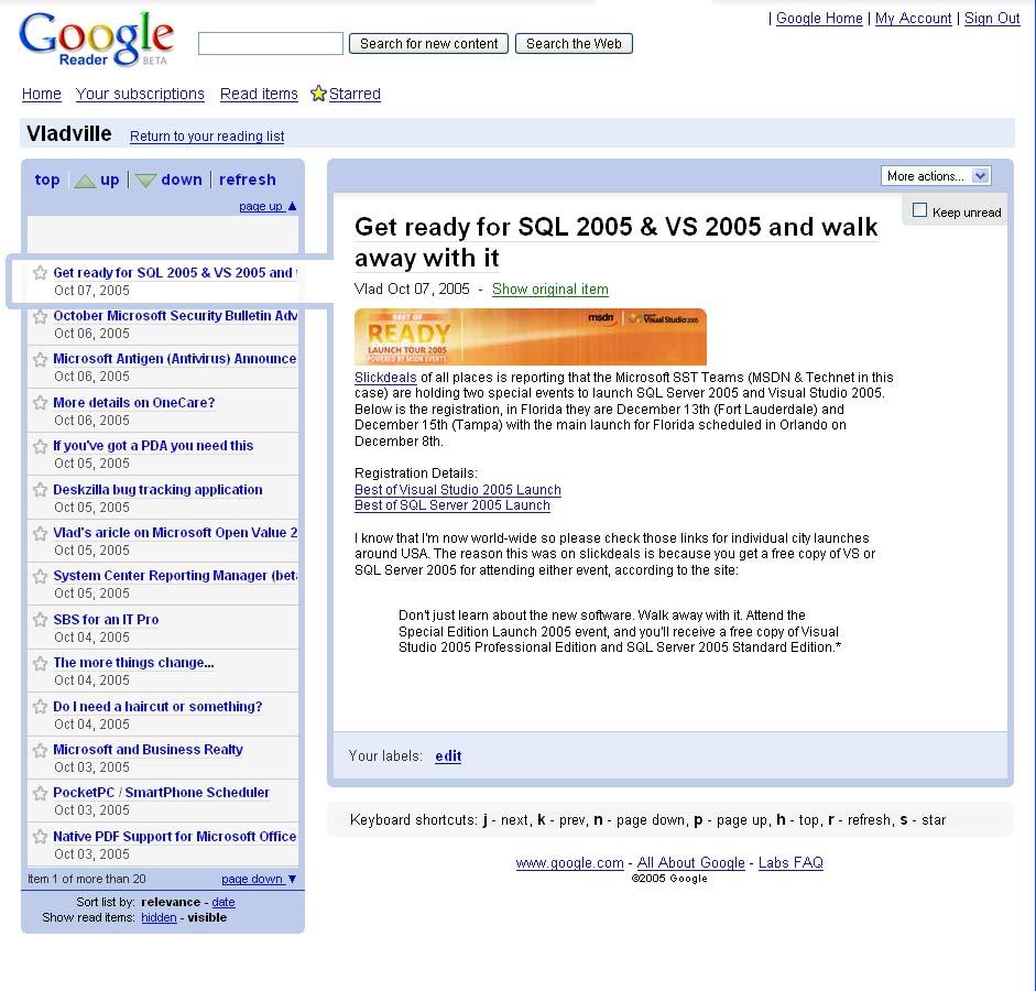 Another day, another Google beta project. This time its the Google Reader, an AJAX based web application intended for RSS reading over the web. Played with it for a few minutes but to be honest, I don’t find it very impressive and will stick with my Google Desktop way of subscribing to feeds. It does seem to be fairly integrated with Blogger and Gmail, however, so it does bring up an interesting “bundling” effect that is slowly but surely moving a lot of the classic desktop applications to the web. Makes you wonder how much harder desktop application ISVs will have to work to compete with AJAX and its ever-growing capabilities to deliver rich and rapidly deployable apps seemingly on-demand.