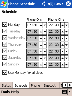 I’ve blogged about this before but I just have to mention it again as its a real time saver, especially for some of you running your business from your cell phone. This little utility works on across the Windows Mobile platform (PocketPC, SmartPhone) and allows you to set a schedule on which your phone is automatically switched on/off. No more remembering to turn your phone off at night, or forgetting to turn it on until lunch the next day.