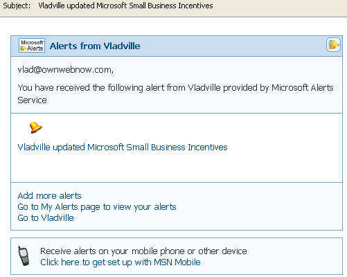 Just when you thought there weren’t enough ways to keep in touch with everything on Vladville, here come MSN Alerts. Clicking on the Alert Me link below will allow you to receive MSN Messenger alerts every time a new story is posted on Vlaville.