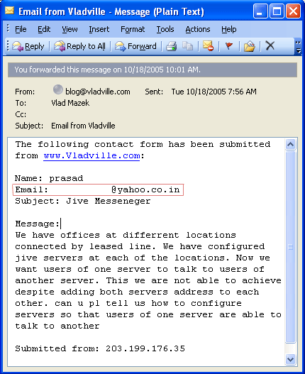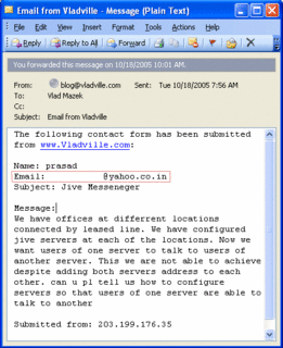 I have now, on this Tuesday, 18th day of October 2005, answered a technical question from a person in India. Parsad, buddy, thank you for making my day. I hope this doesn’t start the disturbing trend of India outsourcing technical support to USA as Chris was very quick to point out.