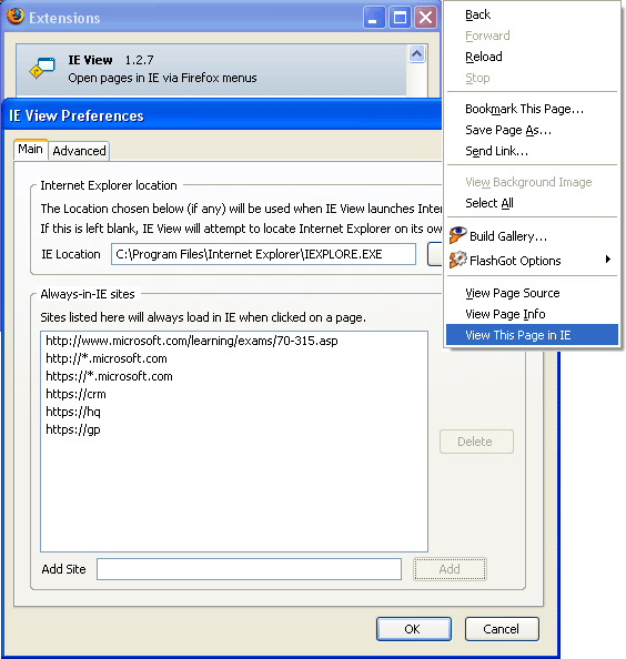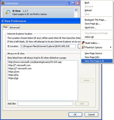 Since Securnia cracked the camels back I've been playing with different things Firefox has to offer. First of all, the major problem is rolling this out in the Enterprise through group policy and Sarah was kind enough to point me to a Firefox MSI repository. So far so good, until I hit the Microsoft Partner site – not very Firefox friendly I'm afraid, but there are two good things that came out of it. Number one, its the only IE-needy side (outside of our corporate internal SharePoint/CRM/GP sites) and it sent me off searching in the Firefox plugin land where I found IE View extension. Thats what the picture below is all about, you just right click on the page that doesn't render properly and select "View This Page In IE". There is even an IE Tab which makes it easier for people that don't like to right click – it adds an icon next to the address bar that opens the page up in a new tab using Internet Explorer as a rendering engine. Reduces desktop clutter! And it can be pre-configured so you can add the sites that should always render in IE. This is simply amazing.