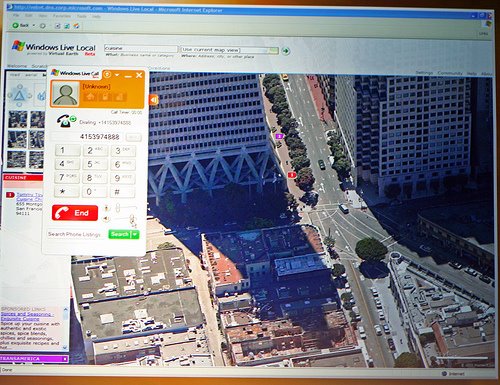 The web page is the interface, but it is not just flat boring HTML. Check out the screenshot to the right, this is the Windows Live Local view, where the person tried to find a restaurant — they got a satellite map of where the restaurant is and and at a click of a mouse they were put into a VoIP session dialing that business. This (although far more elementary) exists in Windows Mobile 5, where you can click on a phone number in a web search and it will automatically dial it. But getting a map, VoIP session and everything at your hands is a big sell.