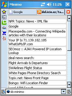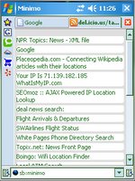 Ok, you need this. Thats all I can say. The new PocketPC web browser based on Mozilla/Firefox code has just been updated to 0.13 and it has some huge improvements. First of all, tabbed browsing. Yes, tabbed browsing on your phone. No more navigating back and forth, open as many maps, pages and directions as you need. Second, and finally, a decent RSS aggregator for your Pocket PC. Need I say more? Go download it! Ok, now the eyecandy: