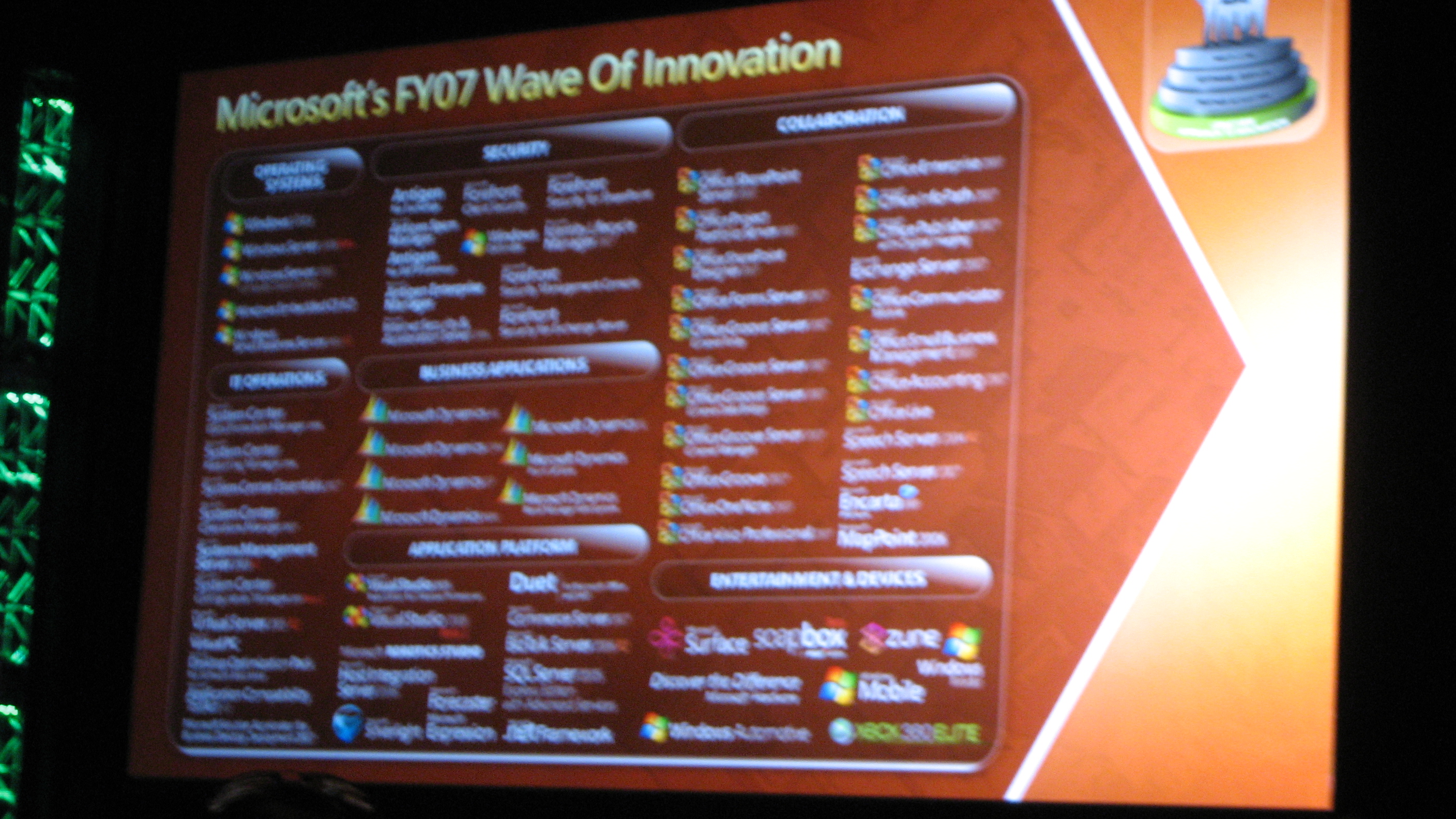 Ok. Frankly, it was all about “innovation” but thats a Microsoft term for “here are all these ideas we’ve stolen or bought from our partners and are now calling it Microsoft *.*” – and next year we’re going to steal twice as much!!! Have to hand it to them, they were quite energizing about the whole prospect and the solution stack and tried to dance as hard as they could away from the core (Client/Server) and towards dynamics, services, hosting, presence, entertainment, mobility, portability. Frankly, it puts up a huge stamp on the fact that Microsoft is going for the capex because those solutions came with a hefty price tag. A very hefty one. The quote of the day?