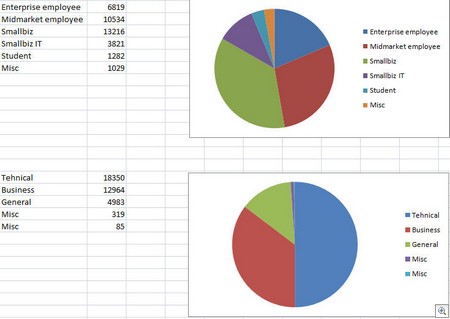 Those are the flat numbers. Now, here is another curveball. When split individually, the smaller audience segments (student, smallbizit, smallbiz and a good portion of midmarket) come here primarily for technical information. The larger organization employees (enterprise and nearly half of midmarket) comes here for business advice.