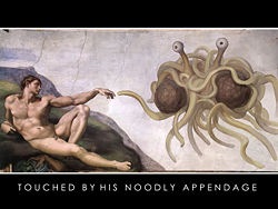 250px-Touched_by_His_Noodly_Appendage First, the Florida School Board decides that Evolution Must Be Taught. I am sure it was very hard for them (vote of 4 to 3) to decide that for the good of this country young minds need to be taught to reason and base conclusions on overwhelming observable evidence over blind faith in the invisible and undetectable Flying Spaghetti Monster which created the entire universe after drinking heavily and created humanity by the touch of his noodly appendage. And while the school system will not consider these creationism theories yet, there may be other places to learn about creationism, like maybe one of millions of churches or Olive Garden restaurants (hey, don’t hate on my beliefs!)