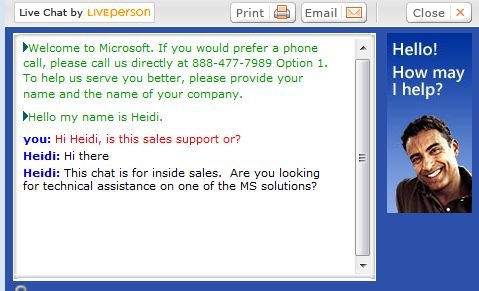 Earlier today Microsoft enabled end-user customers to purchase software and services directly from a Microsoft site, completely bypassing the partner community. While there is a bit about contacting Microsoft Partners for support services if you sit on the site for a few seconds you will be greeted by a popup and a person all too happy to take your money: