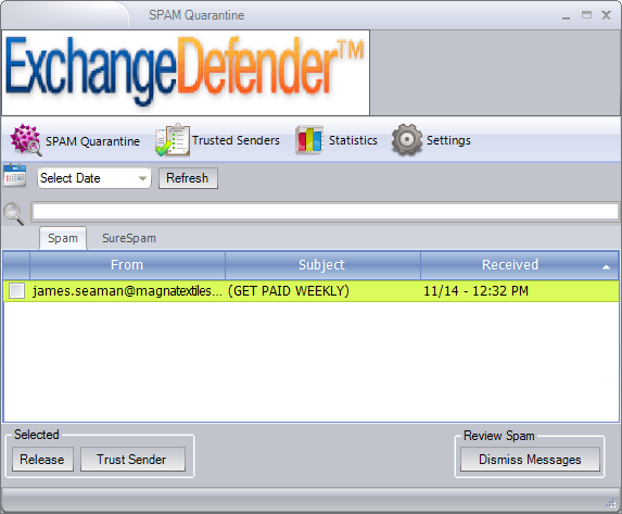 Realtime access to SPAM and SureSPAM listing. Ability to filter, search and show SPAM and SureSPAM for today, yesterday and past 7 days. Click on anything you wish to release, select Trust or Release and it’s in your inbox. If you never want to see it all again just hit Dismiss Messages.