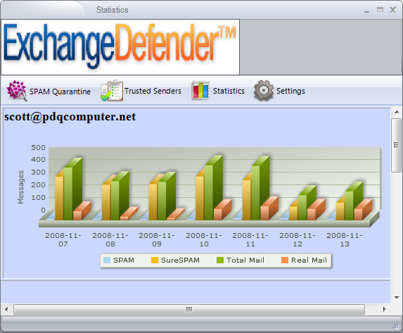 Stats too – For those that complain that ExchangeDefender is not working for them and they haven’t seen any SPAM today or it’s all been SPAM we can actually break out the numbers in realtime.