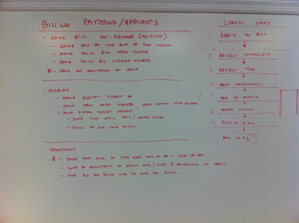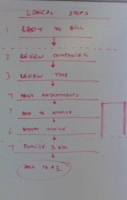 Once all the ideas are on the wall, it’s easy to group those ideas into logical steps. This is where user experience comes to the front because we are approaching our ideas from the angle of a clueless user: “If someone has never used our software, could they figure out what was going on?”