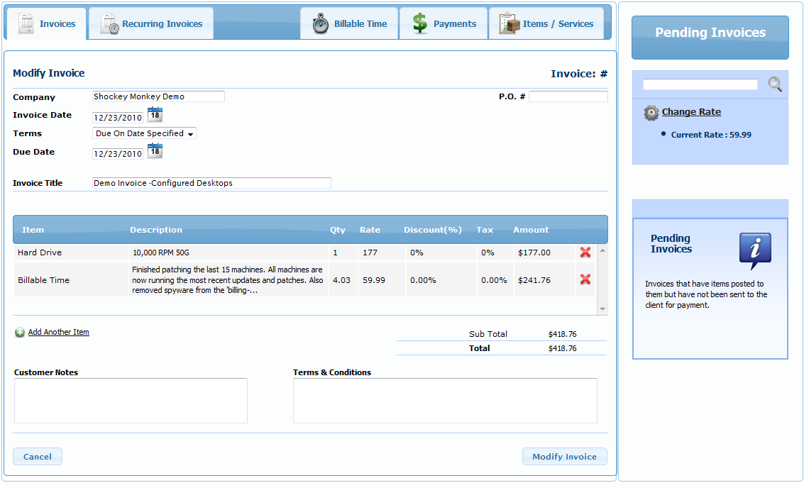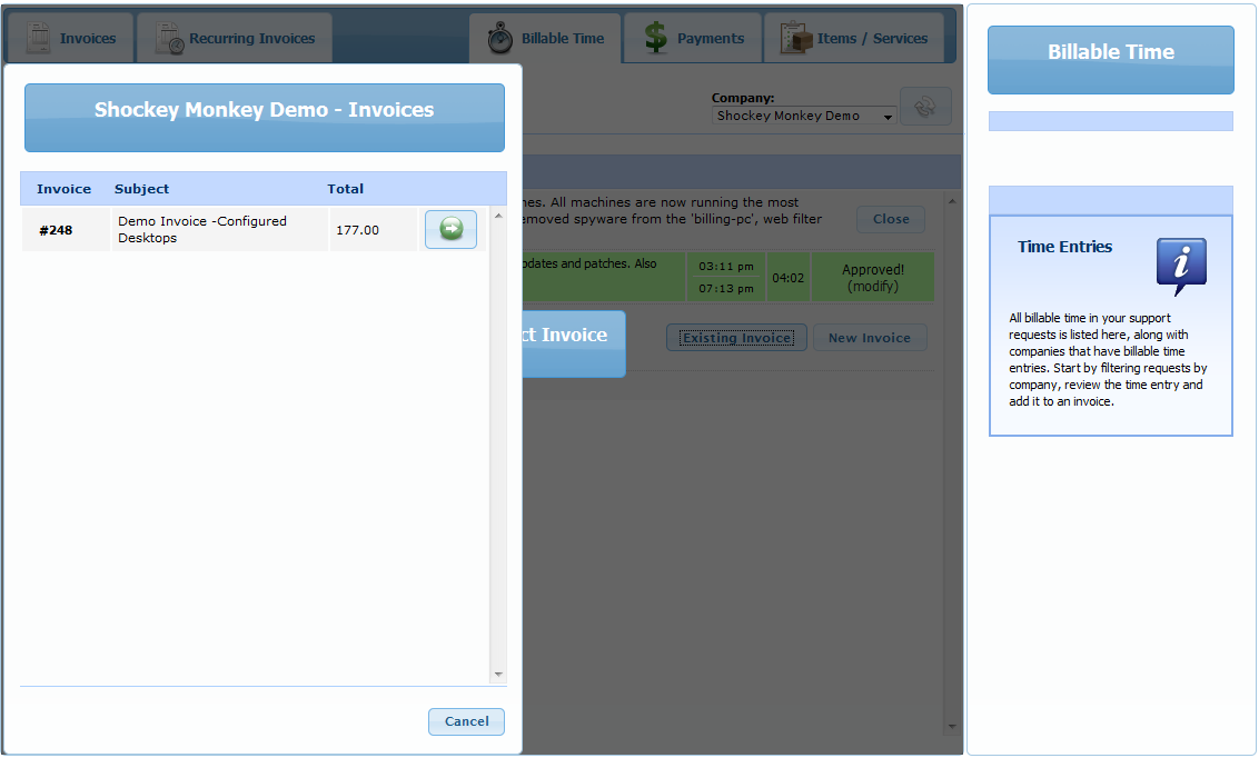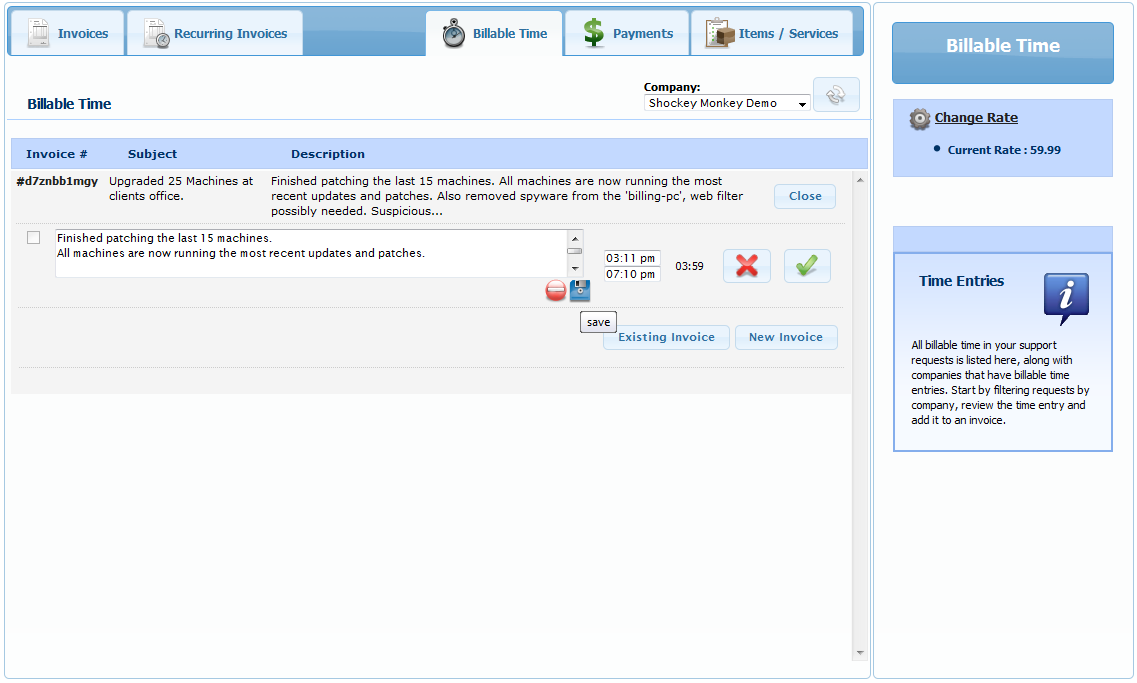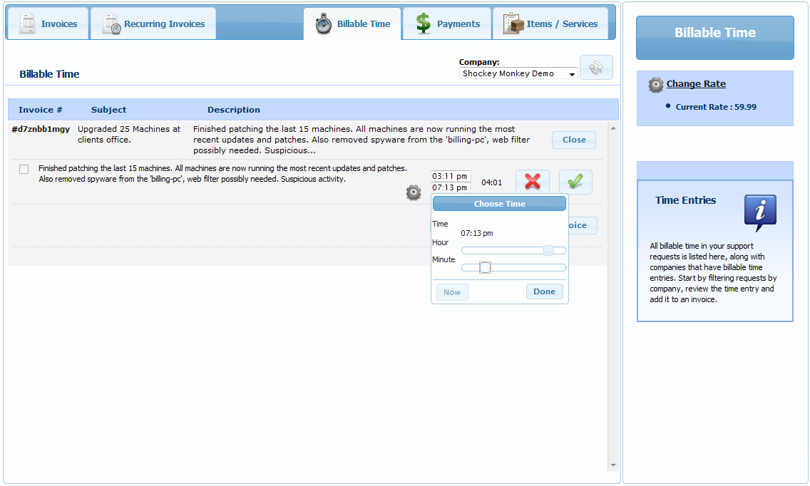 Once you’re done with your approval, just add it to the invoice. This is where it gets tricky – it depends on how you bill and when you bill. Some bill at the beginning of the month and add the hours to the invoice that has the managed services fee. Some bill one week at a time and have a new invoice every time. Some separate time and materials. Some do it at the end of the month. However you do it, Shockey Monkey will work.