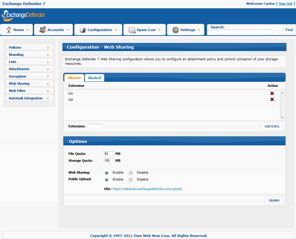 But how do you control it? Simple, from the admin control panel at https://admin.exchangedefender.com you can enable and disable the Public Upload function.
