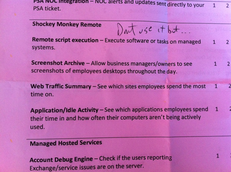 Imagine an environment where this tool is something the businesses you manage get for free. Yes Mr Business Owner, I’ll give you all of this for free if you let me manage your IT infrastructure you’ve invested so much in. All these servers, workstations, desktops, printers, smartphones and tablets need to be taken care of and it’s cheaper and more effective for us to do it than for your VP to be on hold with some third world helpdesk script reader.
