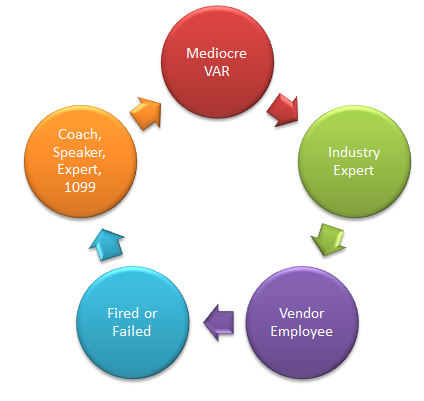 Every now and then you will meet folks who are in webinars / panels / conferences for seemingly no overwhelming success or reason – maybe they just sent in a positive survey on the day that the marketing manager organized a webinar and their sales engineer called out with flu. This is how the Mediocre VAR becomes an Industry Expert that is paraded around the circuit because there is nothing companies love more than uncompensated third party endorsement. Unfortunately in business you can’t fake your way into profitability so eventually these folks end up in significant vendor roles because they “understand our clients business” (dear vendor friends: if they did, they wouldn’t be asking you for a job). Except they don’t, and in real companies you have to show results or you end up back uninstalling spyware for a living.