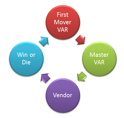VAR realizes it has something on it’s hands and it’s easier to grow the fastest possible way – find similar beasts and teach them how to make a killing. Inventor becomes the vendor and then one of the two things happens: most die when the business model flops or they win out by making acquisitions or being acquired.