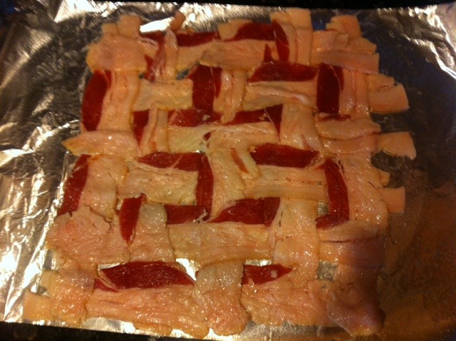 Step 1: Prep the braided bacon icing. Line a foil with some pam and start crossing it one slice at a time.