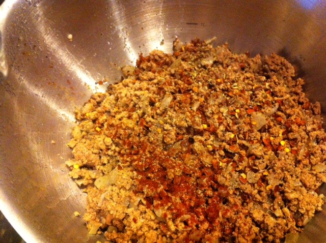 Step 2: Mince onion, garlic and 2 pounds of beef in some oil. Drain when done and season with whatever you want.