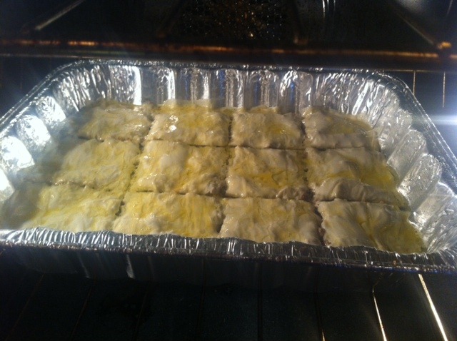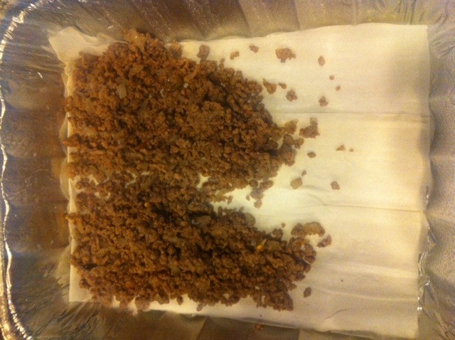 Step 3: Line the bottom of the baking dish with PAM and start layering beef and filo dough. I went with 1 cup between sheets. As far as calories go, filo dough is worse than the 93% ground beef so if you want to cut corners this is where you can do it.