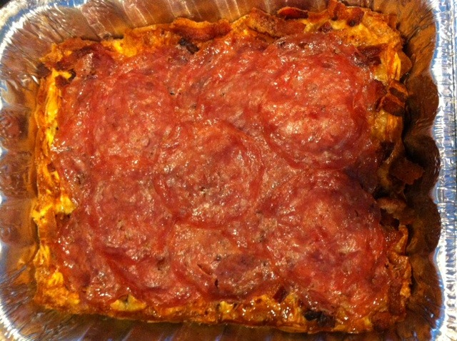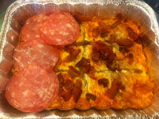 Step 6: This is where it gets obscene. Dump in 1lb of crumbled bacon and top it off with genoa salami.