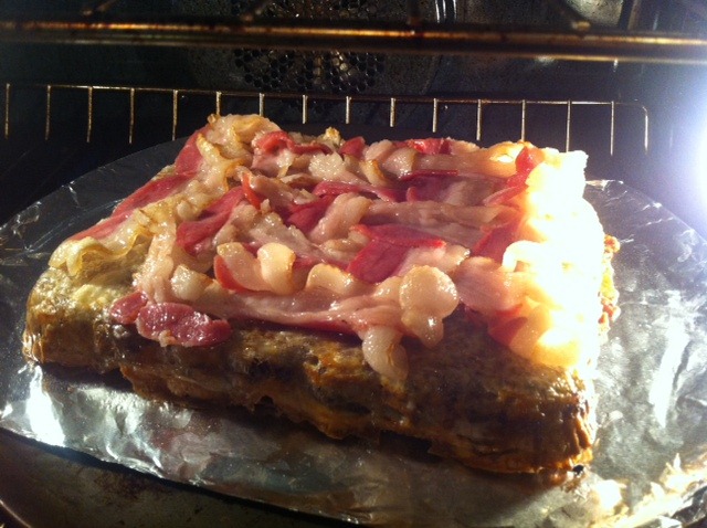 Step 8: Take the meat pie out of the baking dish, flip it and allow it to cool a bit. Apply your bacon braid icing. Back under the broiler.