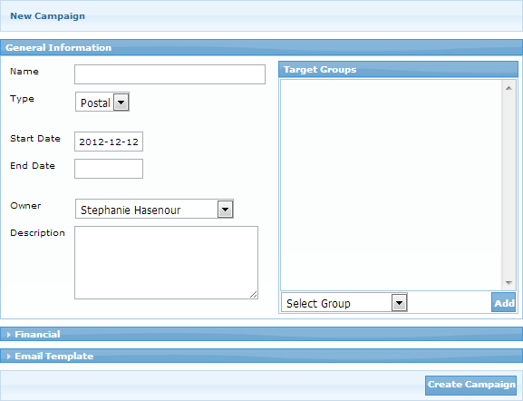 To start a new campaign all you need is a name, type, when it starts, ends, description and a group of leads that were targeted. Done.