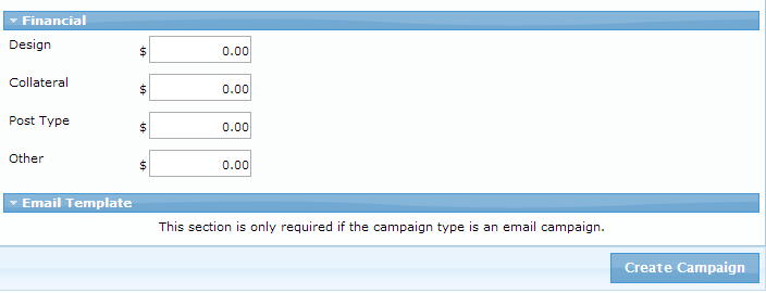 But is it a lightweight? Quite the opposite. One of the benefits of designing this from the ground up is that you get a lightning fast interface that isn’t cluttered with tabs or an experience that makes you feel like you just walked into an airplane cockpit. For example, do you want to track financial terms of the campaign like Design costs, Collateral costs, Postal fees or other user defined fields that you configure for your own campaigns? Just click on the Financial bar and the new section slides into view to document your costs. It’s that simple because if it wasn’t it wouldn’t get done.