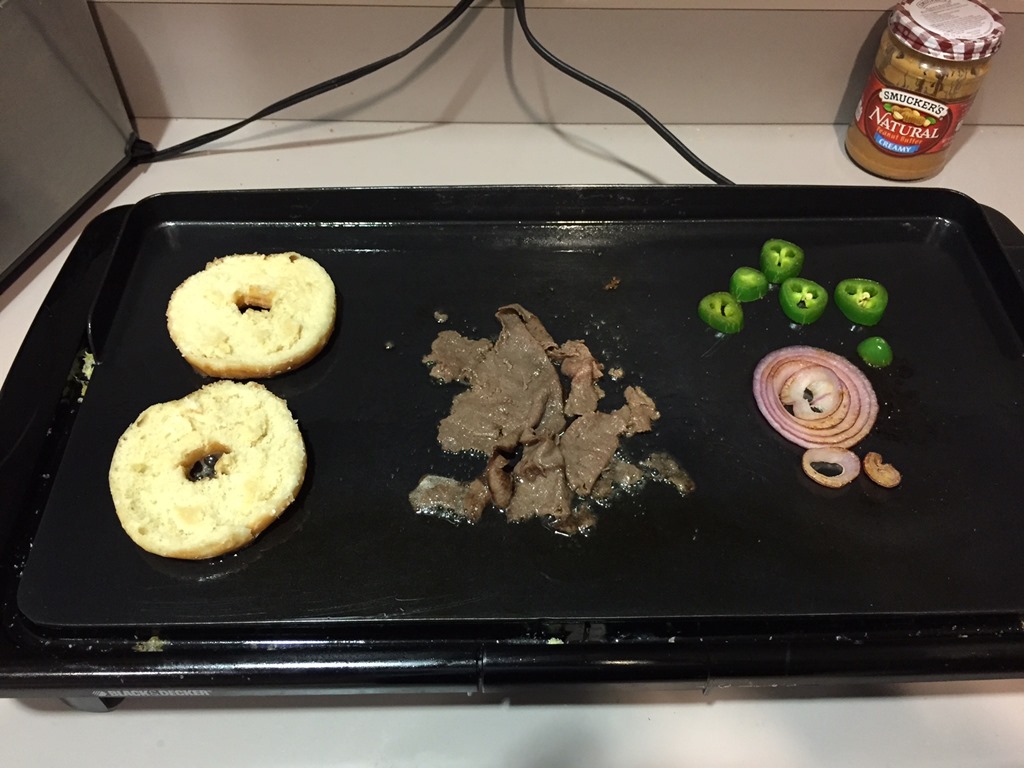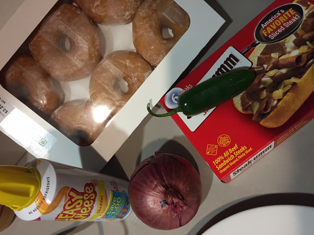 How exactly do you make a donut cheesesteak that doesn’t give you an instant heart attack? If that’s on your mind maybe you shouldn’t try this. Ever. Otherwise you start with your ingredients.